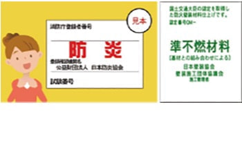 火災から人命を守ることは内装工事の役割。防火壁装管理者である組合員は国が定める適切な施工を行い、燃えないカーペット・カーテンを提供します。その証として防火壁装ラベルと防炎物品ラベルの表示を行っています。