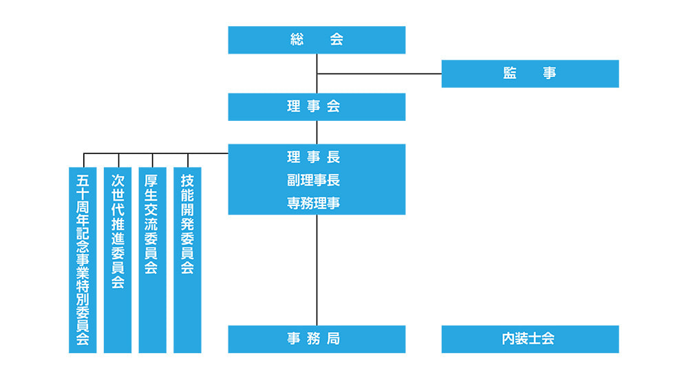 | ■組合組織 | ☆新築ビル・施設・マンションの内装工事専門会社(内装工事専門部会)120社 ☆住宅リフォーム全般工事・家具インテリア品販売会社(消費者販売事業部会)80社 ☆インテリア製品製造メーカー・流通卸商社(賛助会員)22社によって構成する建築内装・ リフォーム専門のプロ集団 |